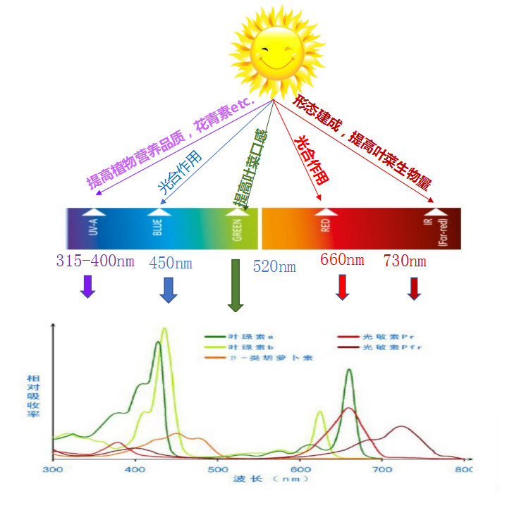 植物对光环境的一系列响应基于感光受体(光合色素、光敏色素等)对光的吸收。根据植物的光吸收特点(图1),植物生长需要多波段的光,即全光谱光照。