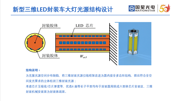新型三维封装LED是环亚币游国际白光事业部在车灯LED领域的最新“高精尖”技术成果,其采用立体柱状集成三维结构,光热耦合设计立体6面出光,设有蒸发区、绝热区、冷凝区三区散热结构,完美解决了传统平面LED光源芯片封装密度低、相邻芯片吸收严重、无法实现大于180°的出光角度等技术难点和痛点。